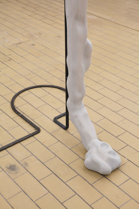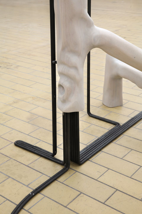 Beemushroomed (2023) is a two-channel video installation that merges ancient shamanistic wisdom with modern developments in vision and perception. It consists of two Hantarex monitors mounted on metal stands, with transparent stained glass panels incorporating Fresnel lenses. The lenses, originally designed by Augustin-Jean Fresnel for lighthouses, are positioned at screen level. This arrangement recalls a scene from Terry Gilliam's 1985 film Brazil, where Fresnel panels comically serve as magnifiers for small monitors in the Ministry of Information offices. The stands and their components, including wooden blocks securing the glass, draw inspiration from Carlo Scarpa's iconic exhibition designs. On view are two monochromatic videos, distorted by the Fresnel lenses, featuring Sine Van Menxel, an artist and friend of Campers. She exudes a calm and composed demeanour, reminiscent of a shaman, as bees gradually gather on her arm. Through this piece, Campers extends his exploration of the theories proposed by Terence McKenna, a dubious American writer, philosopher, and anthropologist known for his provocative views on evolution. McKenna suggested that human consciousness might have its origins in the consumption of psychedelic mushrooms (see Psilocybin Cubensis, 2017). One image that particularly resonated with Campers was found in McKenna's 1992 book Food of the Gods – a depiction of the bee-faced mushroom shaman of Tassili n'Ajjer. This rock painting, discovered on the Tassili Plateau in Algeria, an expanse of rugged stone formations, portrays a figure with a bee's head and mushrooms sprouting from its body, blending human and insect features. Much like the work itself, the painting hints at an ancient correlation between bees, their monochromatic vision, and altered states of consciousness induced by mushroom consumption. These elements converge towards the pursuit of experiences that transcend the confines of rationality or empirical comprehension.
